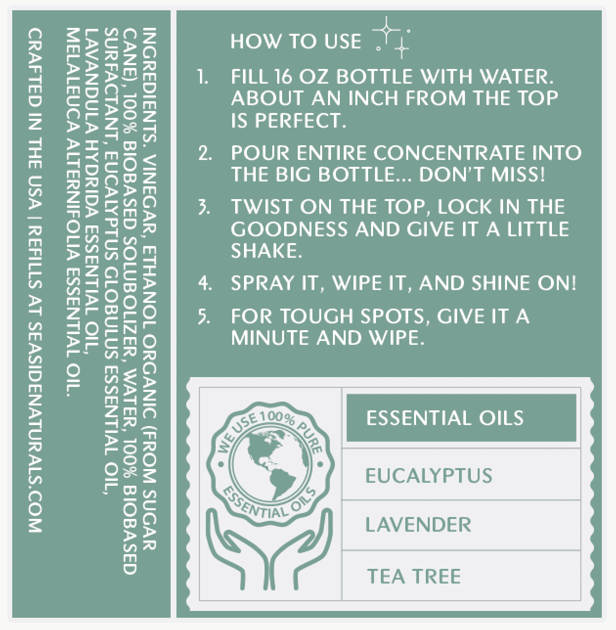 Vinegar Organic, Ethanol (from sugar cane), Biobased Solubolizer, Water, Biobased Surfactant, Eucalyptus Globulus Essential Oil, Lavandula Hydrida Essential Oil Organic, Melaleuca Alternifolia Essential Oil Organic.